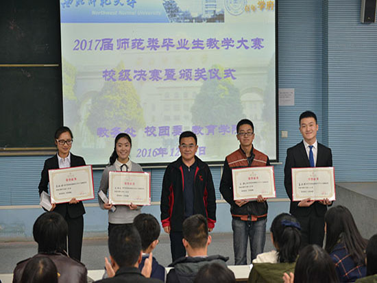 12月3日,学校举行2017届师范类毕业生教学大赛校级决赛暨颁奖仪式。该大赛自11月2日启动以来,2409名师范生参加了院级初赛,51名脱颖而出的选手参加了校级复赛,12名选手晋级决赛。决赛采取集中比赛形式,由实习话感想演讲和模拟授课两项组成。每位选手以自己的实习经历为主线演讲5分钟实习感想,畅谈在教育实习工作舞台的亲身感受,同时向评委提供了书面的教案设计,并根据赛前抽签顺序讲授25分钟模拟课。12名选手同台竞技、公平竞争,最终,我院李旭亮荣获一等奖,王凯荣获二等奖,学院荣获“优秀组织单位”。