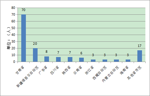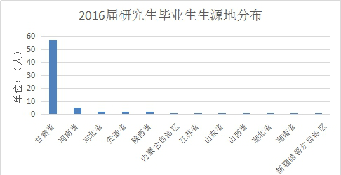 研究生毕业生生源来自全国12个省(市、自治区),其中人数最多的两个省(市、区)分别为甘肃省57名、河南省5名,生源以甘肃省为主(如图1-3所示)。