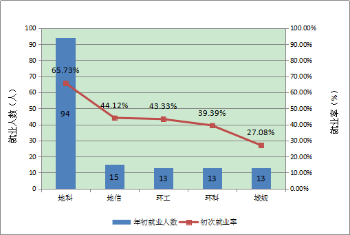 截至2016年6月,我院本科生平均就业率为51.39%。如图1-8所示,地理科学专业就业率较高;人文地理与城乡规划专业就业率较低。环境工程、环境科学、人文地理与城乡规划专业就业人数均为13。