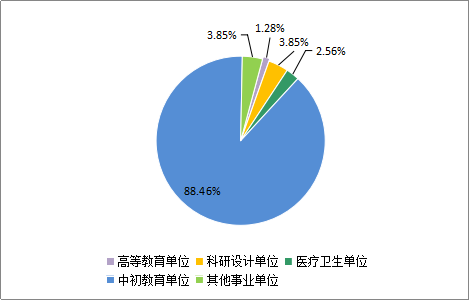 2016届已就业本科毕业生的就业单位性质(如表1-4所示),大部分集中在事业单位和企业,分别占就业生的53.06%和41.50%。其中事业单位以中初教育单位为主,占事业单位就业人数的88.46%,这是主要由于我院地理科学专业属于师范类专业,目前大部分就业方向为中小学地理教师(如图1-12所示)。企业就业的毕业生中在其他企业(非国有企业)就业的占企业就业总人数的88.53%,这说明在新形势下,我院毕业生的就业观念发生了一定改变。