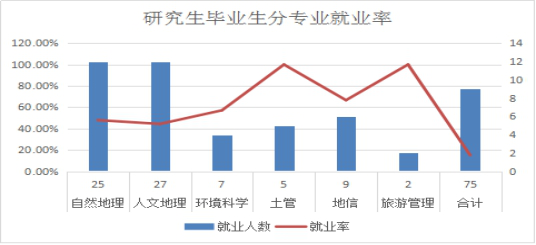 截至2016年12月,我院研究生生平均就业率为51.39%。如图1-9所示,地理科学专业就业率较高;人文地理与城乡规划专业就业率较低。环境工程、环境科学、人文地理与城乡规划专业就业人数均为13。