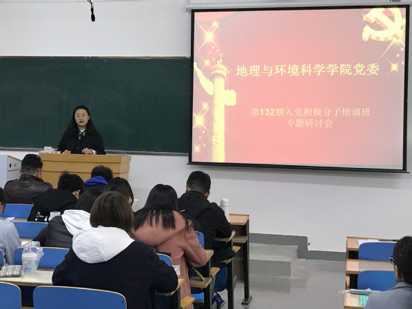 1110日,学院党委举办了第132期入党积极分子培训专题研讨交流会,共有各支部推荐的9位入党积极分子进行了交流发言,主要从“对社会主义核心价值观三个层面的认识”、“作为一名当代大学生如何在学习和生活中践行十九大新党章”、“如何理解文化自信”、“绿水青山就是金山银山”、“牢记使命跟党走”、“生态文明建设与环境保护”等方面谈了自己的认识。