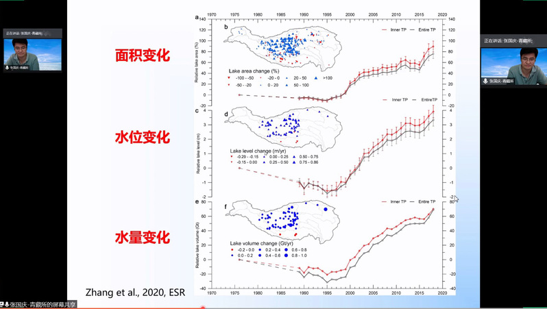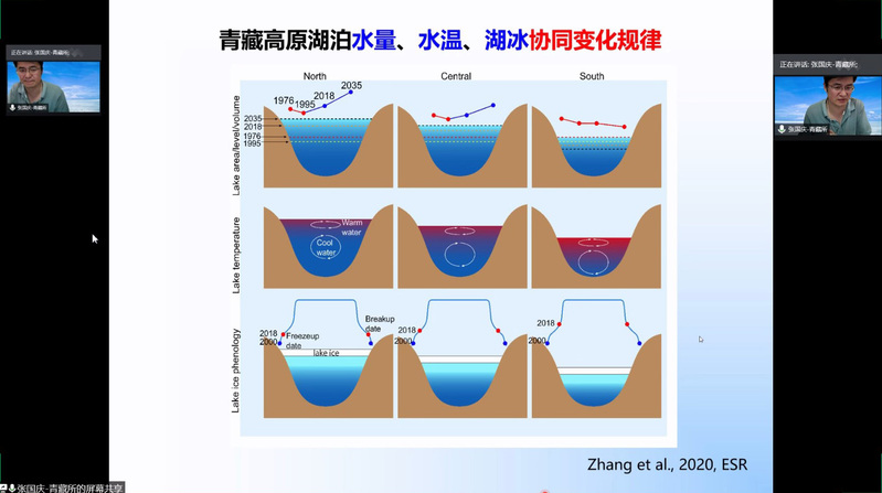 报告会上,张国庆副研究员首先介绍了青藏高原湖泊在全球变化研究中重要性,然后从多源遥感技术应用角度详细阐述了其所在团队围绕青藏高原湖泊数量、面积、水位、水量、水温、湖冰物候等方面所取得的最新研究成果,并结合气候模式对青藏高原湖泊时空变化的驱动机制及未来变化趋势进行了讨论;最后结合青藏高原第二次综合科考介绍了喜马拉雅山冰湖变化及野外考察工作。张国庆副研究员对青藏高原湖泊变化的系统性介绍使师生们进一步了解了气候变化背景下的青藏高原自然生态环境演变,激发了同学们的科研兴趣。报告会结束后,张国庆副研究员与师生们进行了线上交流。