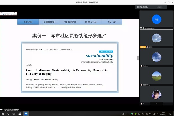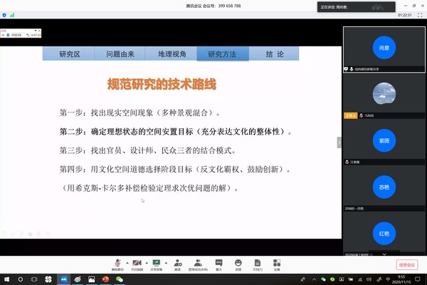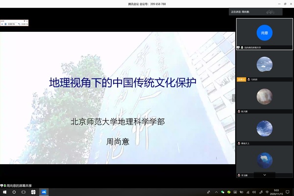 2020年11月15日,应学院邀请,北京师范大学地理科学学部周尚意教授为学院师生做题为《地理视角下的中国传统文化保护》线上学术报告。报告会由马利邦院长主持,地环学院及兄弟院校430余名师生参加。