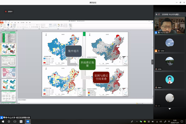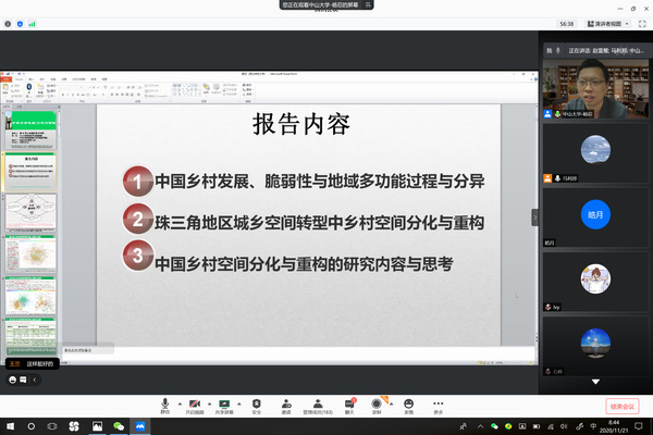 2020年11月21日,应学院邀请,中山大学地理科学与规划学院副教授、博士生导师杨忍在线为学院师生做了题为《中国乡村发展:分化与重构》线上学术报告。报告会由马利邦院长主持,地环学院及兄弟院校240余名师生参加。