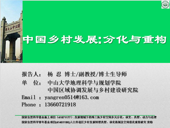 报告会上,杨忍副教授首先对国内外乡村地理学研究热点演化过程、1990年以来西方乡村地理学理论演化进行了回顾,指出:乡村地理学在新时期肩负着为乡村可持续发展和全面振兴提供理论支撑和科学决策的学科使命,中国乡村地理学研究和理论建构也面临最为关键的机遇期。之后,杨老师从中国乡村发展及多功能转型过程及机制、珠三角地区城乡空间转型中乡村空间分化与重构、中国乡村空间分化与重构的研究内容与思考等三个方面结合本人研究进行了详细的讲解。最后,杨老师提出“应融合中西方乡村研究的理论和方法,深度进行多学科交叉综合集成,以乡村人地关系地域系统的要素、结构与功能的演化过程、动力与效应为研究主线,建设多维一体化的乡村地理学理论”。