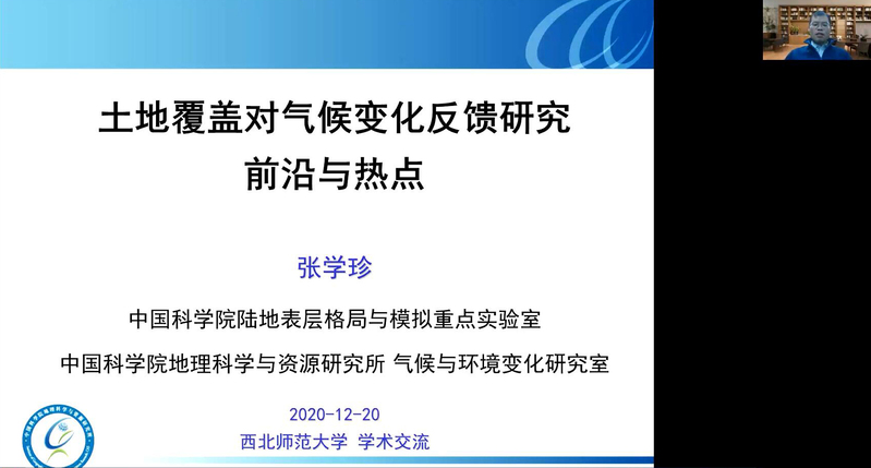20201220日,应学院邀请,中国科学院地理科学与资源研究所张学珍研究员在线为学院师生做题为《土地覆盖对气候变化反馈研究前沿与热点》学术报告。报告会由姚晓军副院长主持,学院140余名师生参加。