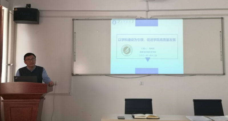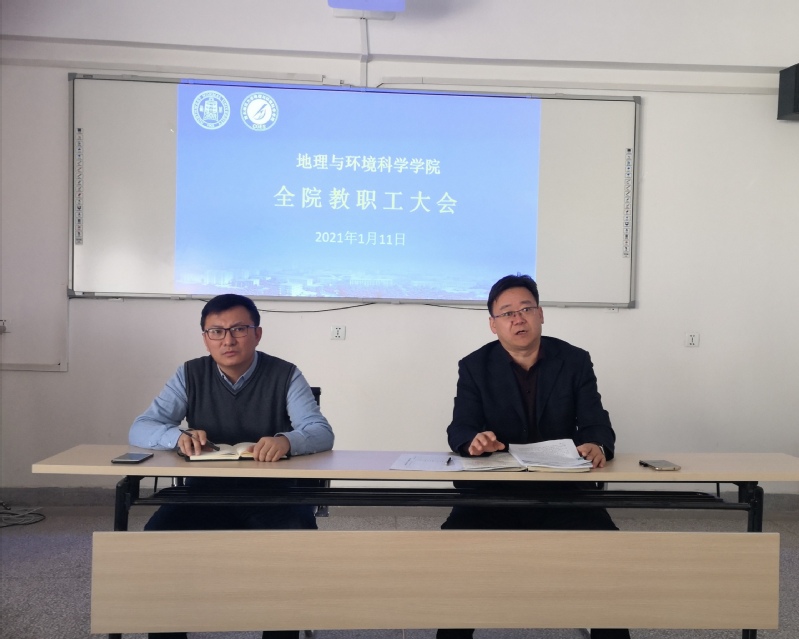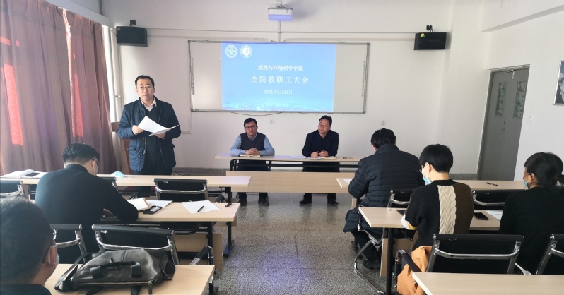 2021年1月11日上午,地理与环境科学学院2021年第一次教职工大会在综合实验楼801会议室召开,学院班子成员及全体教职工90余人参加了会议,会议由学院党委书记于国建主持。