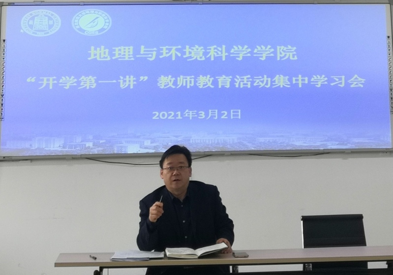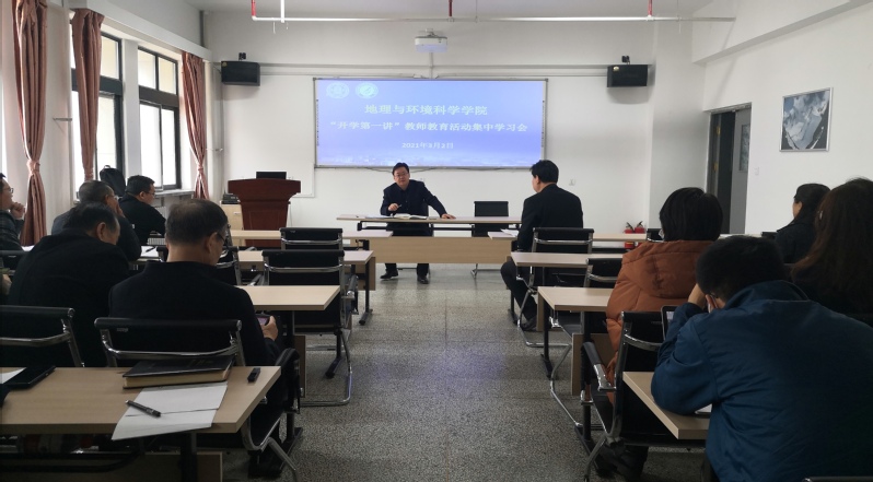 2021年3月2日下午,437bwin必赢国际官网在综合实验楼801会议室召开新学期教职工大会及“开学第一讲”教师教育活动集中学习会,全体教职工90余人参加了会议,会议由学院党委书记于国建主持。