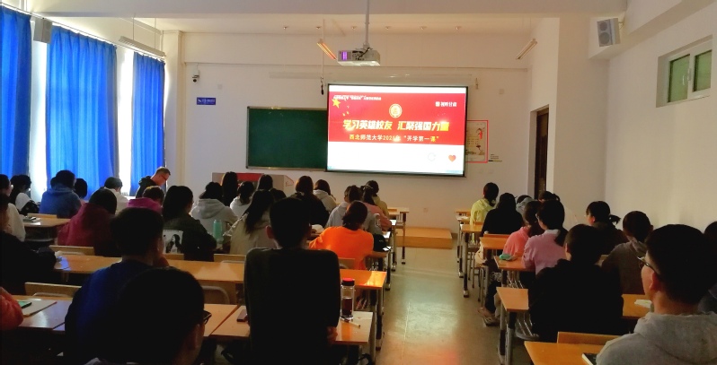 2021年3月5日下午,在第58个学雷锋纪念日和中国青年志愿者服务日这个特别的日子里,西北师大“致敬英雄”大讲堂举办“学习英雄校友·汇聚强国力量”——437bwin必赢国际官网2021年“开学第一课”。437bwin必赢国际官网党委书记于国建同2020级地理科学二班学生、学院辅导员同2020级研究生、学院其他年级学生分别在特教楼227教室、综合实验楼801会议室、综合实验楼实验室、教室、学生寝室,通过多种方式观看“开学第一课”直播。