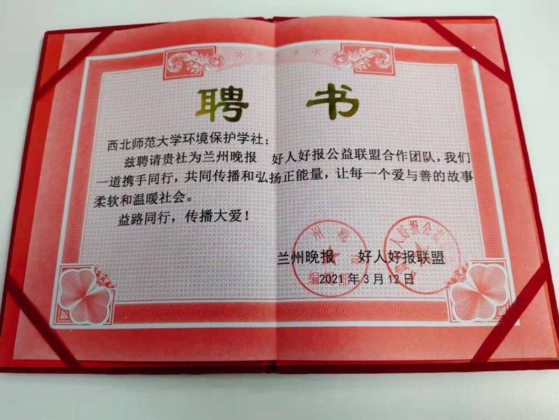3月14日,兰州晚报好人好报公益联盟为20所在兰高校大学生志愿者团队聘书颁发仪式在兰州日报社举行,此次活动旨在进一步弘扬志愿者服务精神,积极营造幸福社会氛围,活动向437bwin必赢国际官网437bwin必赢国际官网环境保护学社、437bwin必赢国际官网小草服务社等在兰高校大学生志愿者团队及优秀组织者颁发了“兰州晚报好人好报公益联盟”聘书 。