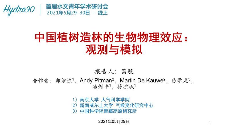 2021年5月29日至5月30日,第一届Hydro90会议线上召开。本次会议设置气候变化及人类活动对流域生态水文过程的影响、树木年轮记录的水循环历史、卫星技术(重力卫星、测高卫星等)在水文领域的应用拓展或前景、人工智能/机器学习/深度学习在水文领域的现状和前景、极端天气气候事件(高温干旱/暴雨洪水)的时空特征、机制与预测等8个议题。我院徐世琴老师为气候变化及人类活动对流域生态水文过程的影响议题的召集人,来自加州大学洛杉矶分校、德克萨斯州立大学奥斯汀分校、中山大学、南京大学、河海大学等国内外高校与研究院所的学者做了精彩报告,并开展了广泛、深入的交流。