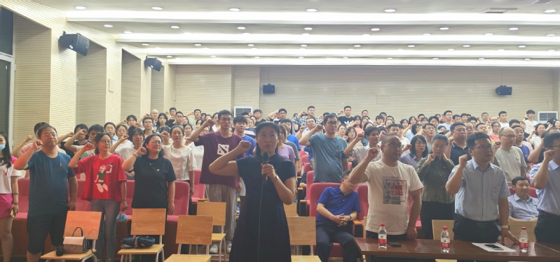 表彰环节结束后,与会的74名新发展的预备党员在胡梦珺老师的带领下进行了入党宣誓,在场的其他师生党员重温了入党誓词。