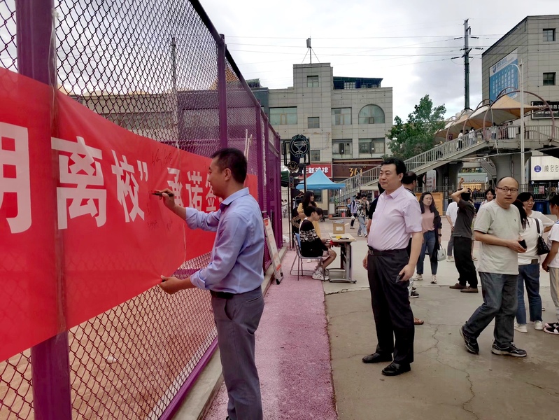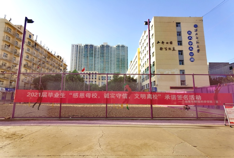 6月7日至27日,地理与环境科学学院在兰天学生公寓举办了“2021届毕业生‘感恩母校、诚实守信、文明离校’承诺签名活动”,在公寓广场上悬挂了醒目的横幅,有序引导全体毕业生郑重地在横幅上签写了自己的名字,对母校进行了离别前的承诺。