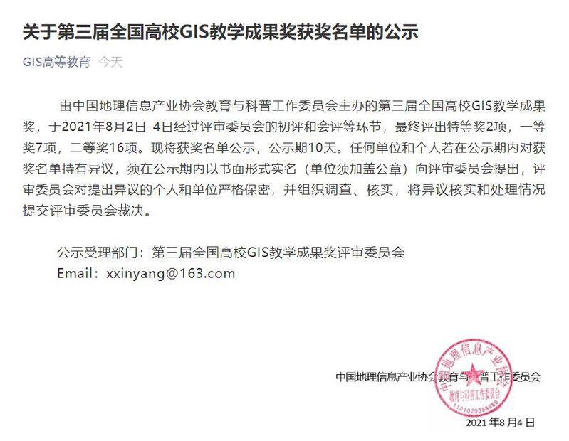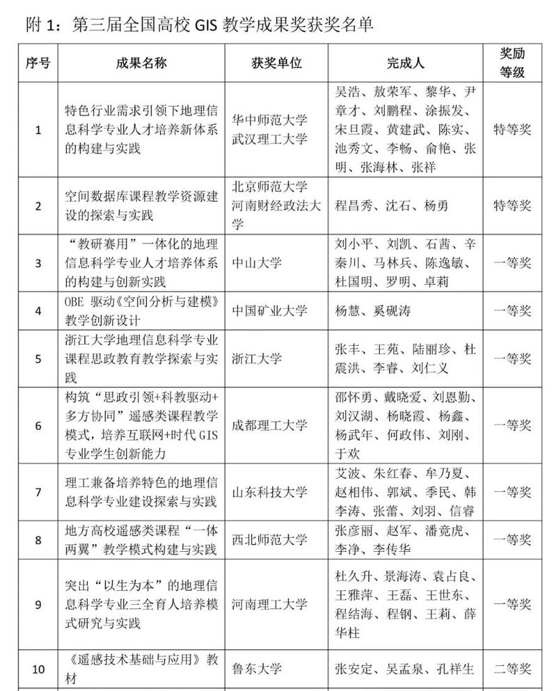 全国高校GIS教学成果奖由中国地理信息产业协会教育与科普工作委员会、教育部高等学校地理科学类专业教学指导委员会共同设立,每两年评选一次,旨在奖励在我国高校地理信息教学实践、改革、研究中取得优秀教学成果的单位和个人。