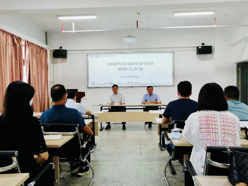 2021年9月6日下午,地理与环境科学学院2021年秋季第一次教职工大会在综合实验楼801会议室召开,学院班子成员及全体教职工100余人参加了会议,会议由学院党委书记于国建主持。
