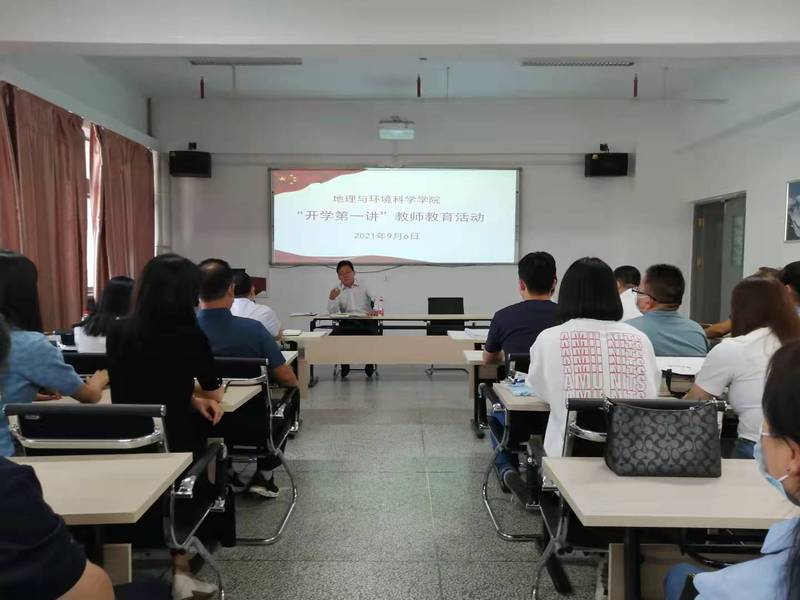 2021年9月6日下午,437bwin必赢国际官网在综合实验楼801会议室召开新学期教职工大会暨“开学第一讲”教师教育活动集中学习活动,全体教职工100余人参加了会议,会议由学院党委书记于国建主持。