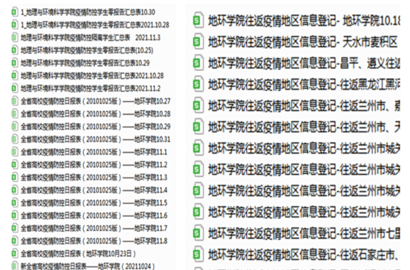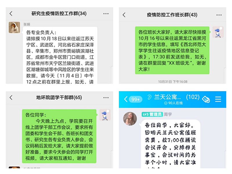 面对肆虐的疫情,全体辅导员发扬钉钉子精神,坚持“学生走到哪里,管理和服务就跟到哪里”的理念,工作更实、更细,专门建立了防疫班长群、宿舍长群等进行网格化管理,关注疫情数据、发送温馨提示、转发官方信息,做到全覆盖、不遗漏,每日进行线上排查、统计,坚持“日报告、零报告”制度,并将健康状况进行分类统计,做到了“底数清”、“数字准”、“情况明”,并实时向学院领导汇报,及时将中高风险地区旅居史学生信息以及“黄码”学生信息上报学校,做好疫情数据管理的统计员。辅导员曹珍璇、田洪宇每天都奋斗在疫情防控相关数据报送和疫情阻击的第一线,始终坚持“战时状态,不漏一人”的原则,用自己的爱心和责任为学生们保驾护航。