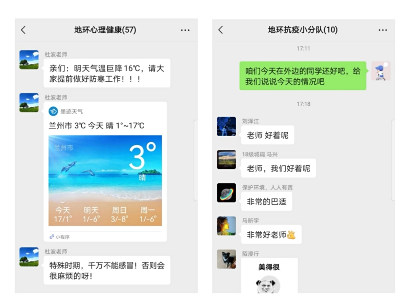疫情就是命令,防控就是责任。突如其来的德尔塔变异毒株,兰州告急,一夜之间,整个城市“静”了下来,在这场没有硝烟的战役中,地理与环境科学学院全体辅导员坚决贯彻学校关于做好疫情防控工作的相关要求,积极开展疫情防控宣传教育工作,全力打好疫情防控阻击战。他们闻声而动、守望坚守,危机中彰显责任与担当,疫情前不畏艰险逆行而上,一个又一个电话,一条又一条信息,承载着对学生的牵挂与嘱托。在这场战“疫”中,他们战斗与暖心并举、防疫与育人结合,用自己的爱心守护,筑起抗击疫情的最强防线。