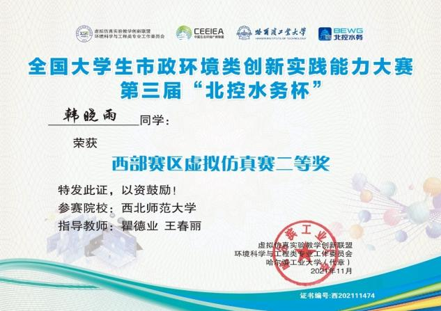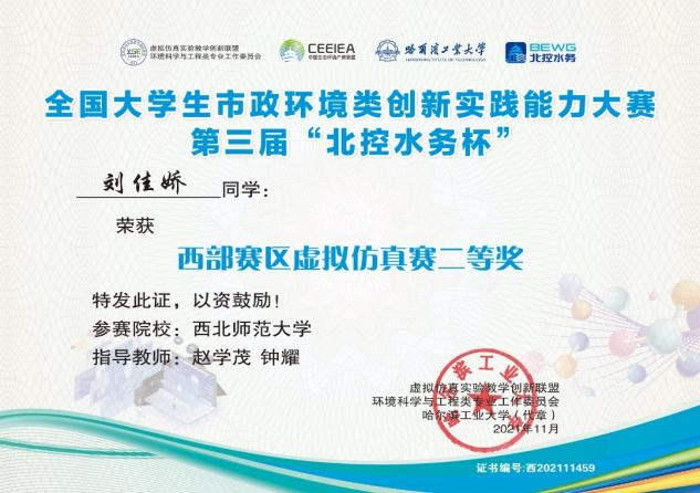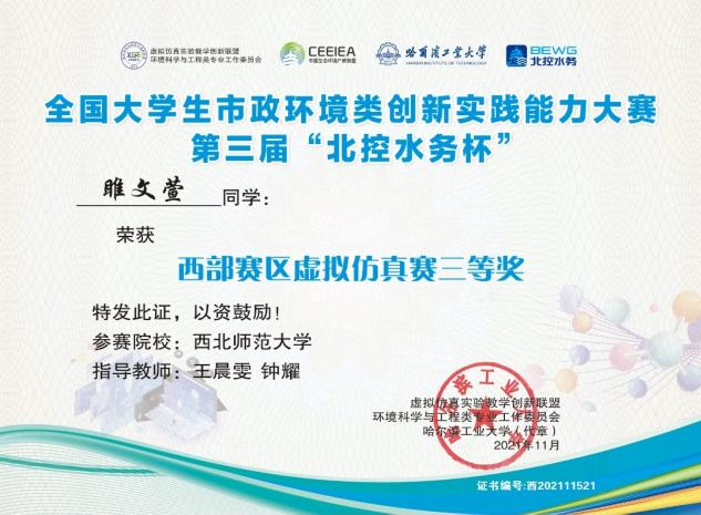 近日,437bwin必赢国际官网环境科学与工程系师生参加了由虚拟仿真实验教学创新联盟环境科学与工程类专业工作委员会、生态环境产教联盟、哈尔滨工业大学、同济大学、南开大学、兰州大学、北控水务集团和北京欧倍尔软件技术开发有限公司共同举办的2021年全国大学生市政环境类创新实践大赛(在线),2019级环境工程(卓越班)刘佳娇、2020级环境工程(卓越班)刘洁和韩晓雨同学获得西部赛区虚拟仿真赛二等奖,2019级环境工程(卓越班)孙丽婷、2020级环境工程(卓越班)康凯和睢文萱获得西部赛区虚拟仿真赛三等奖。张萍、赵学茂、王春丽、钟耀、瞿德业和王晨雯老师被评选为“优秀指导教师”,瞿德业老师获得“金牌裁判”的荣誉称号。