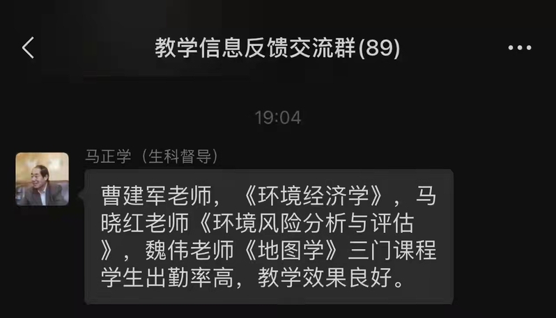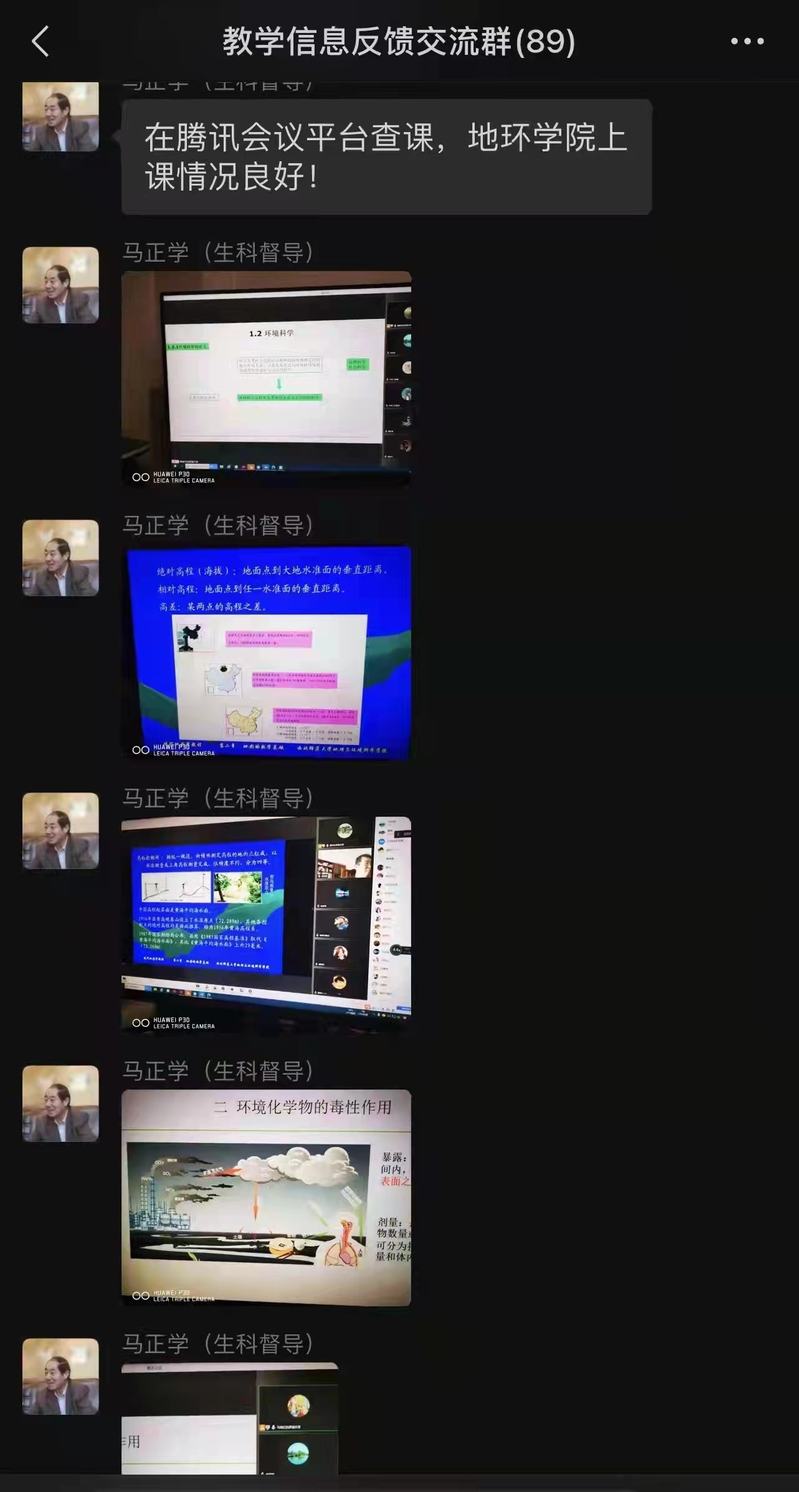 学院教学督导组成员赵军、巨天珍、张松林、辛存林、胡梦珺、张学斌等6位老师也积极参与督导检查,确保线上教学有序开展。学校教学督导马正学老师在网上巡课后反馈,“地环学院学生到课率高,教学效果良好”。学院领导在走访学生宿舍时,同学们表示“和课堂上面对面教学相比,线上课程我们和老师只能屏幕对屏幕,虽然不能和老师见面,但老师对于课程的准备、要求、课后的作业与答疑做了详尽的安排,保障了我们课程的学习进度和程度,授课和学习的效果并没有受到太大的影响,我们一起努力,共克时艰。”地理科学系2021级同学纷纷表示。