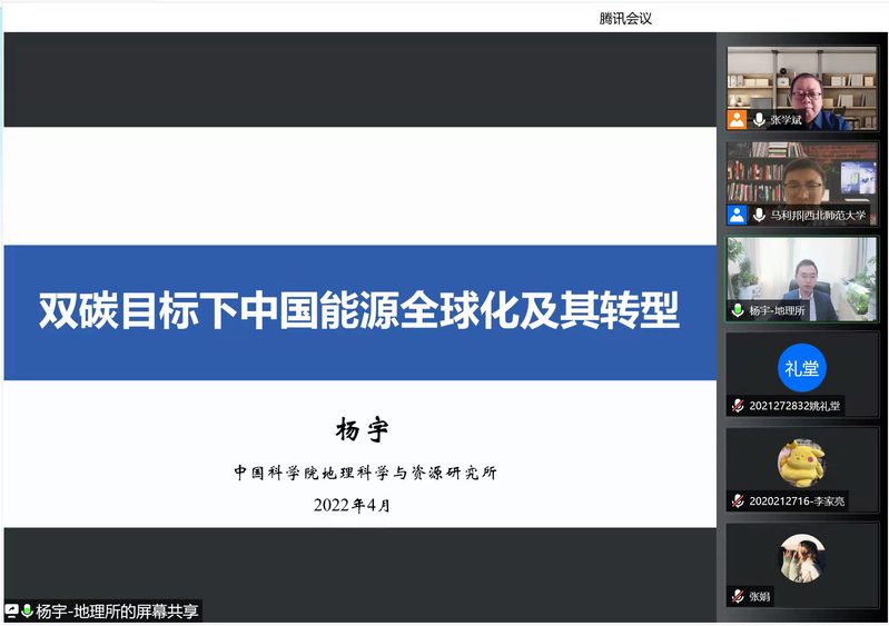 2022年4月3日,应437bwin必赢国际官网437bwin必赢国际官网、甘肃省绿洲资源环境与可持续发展重点实验室、西北城乡发展与协同治理研究院邀请,中国科学院地理科学与资源研究所杨宇研究员做了题为《双碳目标下中国能源的全球化及其转型》的学术报告,报告会由437bwin必赢国际官网张学斌副院长主持,学院近300名师生线上参加了本次学术报告。
