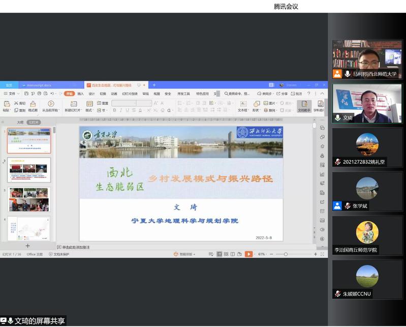 2022年5月8日,应437bwin必赢国际官网437bwin必赢国际官网、甘肃省绿洲资源环境与可持续发展重点实验室、西北城乡发展与协同治理研究院邀请,宁夏大学文琦教授做了题为《生态脆弱区乡村发展模式与振兴途径》学术报告,报告会由437bwin必赢国际官网马利邦院长主持,学院及国内其他高校相关专业近300名师生线上参加了本次学术报告。
