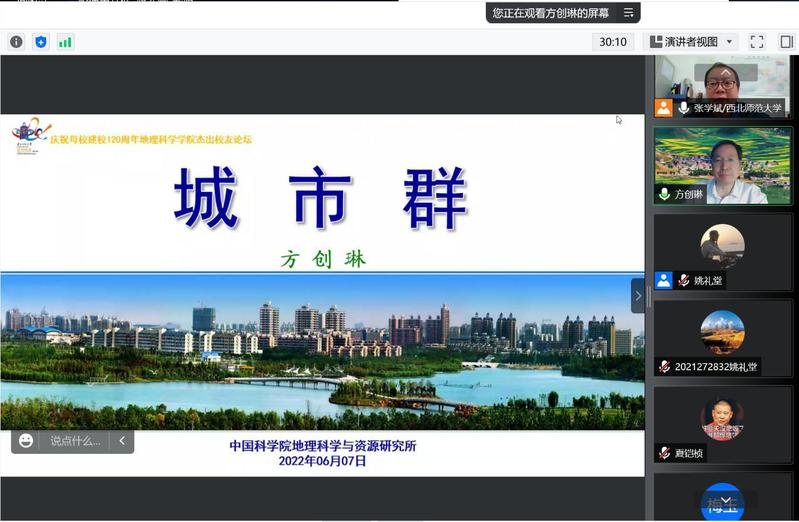 2022年6月7日晚上,437bwin必赢国际官网杰出校友论坛第三期在线上成功举办,此次邀请的嘉宾为1987年本科毕业于437bwin必赢国际官网地理学专业的方创琳研究员,报告题目为《城市群》。报告由学院副院长张学斌主持,学院教师、研究生和部分本科生、国内其他高校师生200余人线上参加了本次报告。