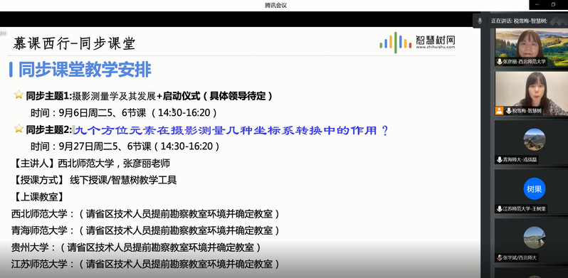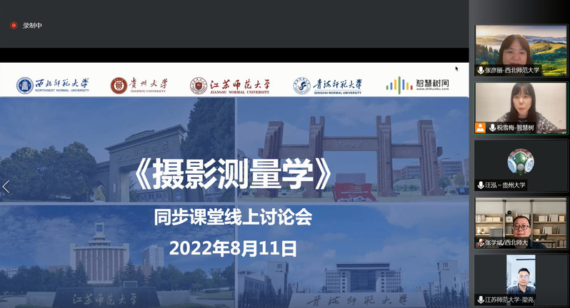 课程负责人张彦丽副教授介绍了《摄影测量学》慕课基本情况、同步课堂授课内容、授课形式及初步计划;贵州大学、江苏师范大学和青海师范大学主讲教师汪泓教授、王树果副教授和戎战磊副教授分别介绍了本校课程开设情况及对同步课堂的设想。经与会老师热烈讨论,最终商定了2次同步课堂主题、授课时间等相关内容。