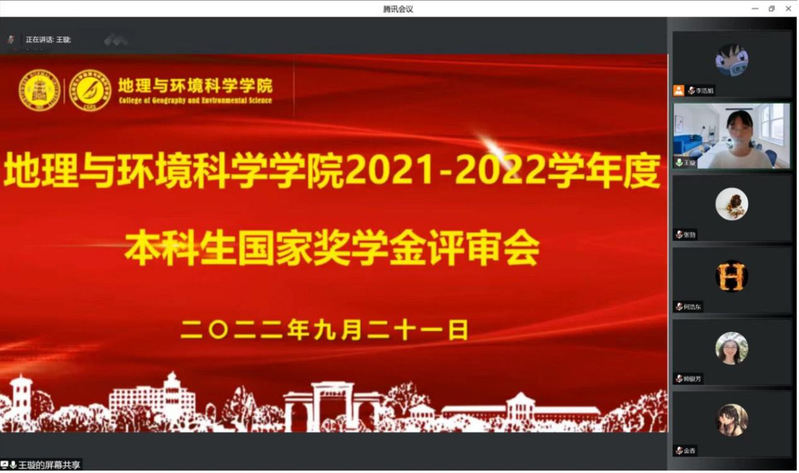 9月21日,地理与环境科学学院召开2021—2022学年度国家奖学金线上评审会,学院党委副书记陈建海、张勃教授、瞿德业副教授、师银芳副教授、成亮老师、专职辅导员老师及学生代表共10人组成评委会参加评审