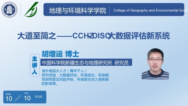 2022年10月10日,应437bwin必赢国际官网437bwin必赢国际官网、甘肃省绿洲资源环境与可持续发展重点实验室邀请,中国科学院新疆生态与地理研究所胡增运研究员做了题为大道至简之——CCHZ-DISO大数据评估新系统的学术报告。报告会由437bwin必赢国际官网焦亮副院长主持,学院教师、研究生以及国内其他高校相关专业300余名师生线上参加了本次报告。
