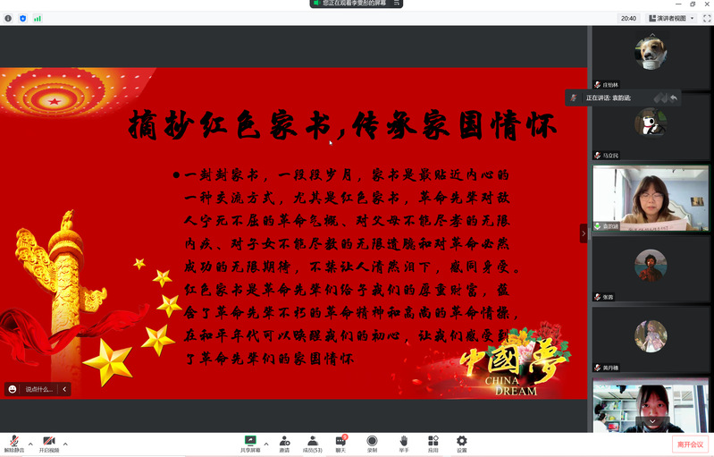 10月13日下午,2022级地理科学2班团支部特别举办了以“家书寄情”为主题的主题团日活动,创新发掘红色书信的深厚育人内涵,以红色文化与革命精神激励青年、感召青年、鼓舞青年。同学们共同聆听红色故事,品读书信中跨越时空的思想光辉,仰望坚定理想信念的伟大力量。活动在观看《喜迎二十大》宣传片中拉开了序幕。由3名同学带来红色家书《许英给母亲的信》《傅雷家书》《赵一曼写给儿子的信》的朗读摘抄分享会,让淹没在时代尘埃中的无名英雄重新焕发光彩,让现场同学们仿佛置身厚重的历史当中,感受到在革命年代无数中华儿女捍卫祖国,坚守信仰,最终开辟崭新时代的奋斗历程。