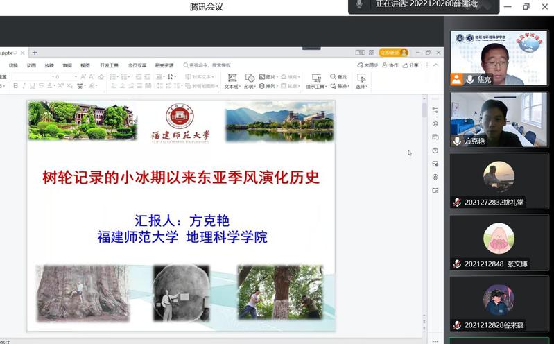 报告会上,方克艳研究员从全球气候变化、树木年轮与气候变化、福建地区树轮气候重建、太平洋多年代际变率四个方面,详细阐述了全球气候变化特征、古气候学代用材料和时间尺度、树木年代学研究体系和树轮开展气候重建优势及树木年轮记录的气候历史重建研究案例等内容。同时方克艳研究员结合其课题组近期研究成果,重点介绍了结合树木年轮方法开展的东南地区春季低温重建与社会韧性、200年来江南春雨与夏季风期干旱的协同变化特征、太平洋地区多年代际气候协同变化等内容。报告会后,方克艳研究员与线上参会的学院及其他高校师生进行了广泛交流。
