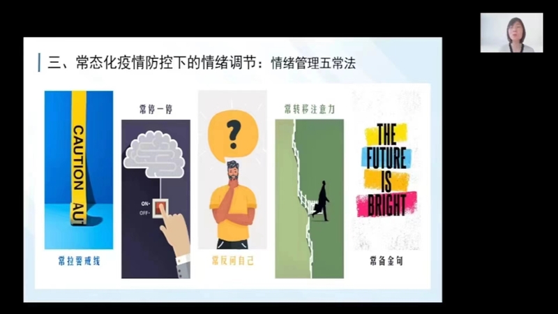 报告中,朱雅雯副教授首先分析了疫情形势下学生心理健康可能面临的突出问题,重点围绕常态化疫情防控学生压力与情绪管理、常见心理问题调适等进行了详细的讲解,引导同学们妥善解决好常态化疫情防控情况下的学习问题、家庭问题、生活问题、情感问题,积极鼓励同学们养成良好的生活和学习习惯,不断提升发现问题、正确认识问题、有效矫正心态、理性调控情绪的综合能力。