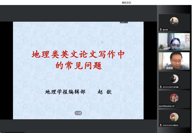 报告会上,赵歆研究员以地理学论文为例,从科技论文的题名、摘要、引言、材料与方法、研究区、研究结果、讨论、结论及参考文献等方面,详细讲解了论文结构各部分所包含的主要内容及写作注意事项;通过案例着重介绍了如何在地理类论文写作中做到准确的文字表述和规范使用地图,最后结合自己多年来的编辑经验指出了论文中英语常见的问题及投稿注意事项。报告会后,赵歆研究员与在线师生进行了积极互动和交流。