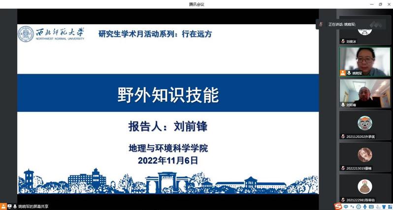 报告会上,刘前锋老师根据多年户外活动和救援经历,从野外风险分析与防范、野外生存技巧、野外装备使用等方面,系统讲述了野外常见风险类型及其防范措施、衣食行住等生存技巧与注意事项、各类野外装备及其应用环境等野外生存基本常识。学习野外生存知识,掌握野外生存基本技能,对于野外调研和科考工作具有十分重要的意义。报告会后,刘前锋老师与线上师生积极互动,取得良好成效。