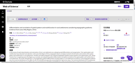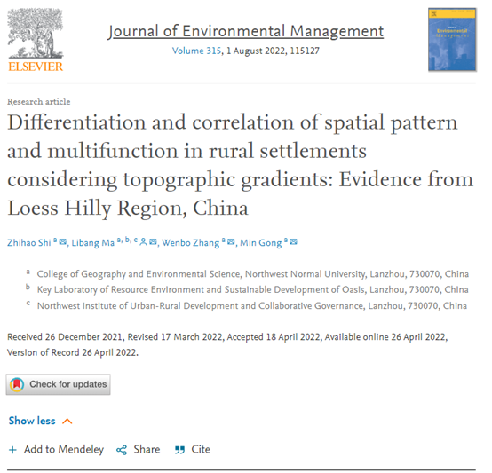 据近日公布的ESI(Essential Science Indicators)数据库最新统计数据显示,437bwin必赢国际官网马利邦教授为通讯作者、硕士研究生石志浩为第一作者在SCI二区Top期刊《JOURNAL OF ENVIRONMENTAL MANAGEMENT》(IF=8.91)上发表的论文“Differentiation and correlation of spatial pattern and multifunction in rural settlements considering topographic gradients: Evidence from Loess Hilly Region, China”入选ESI全球热点论文。该论文正式发表于2022年8月。