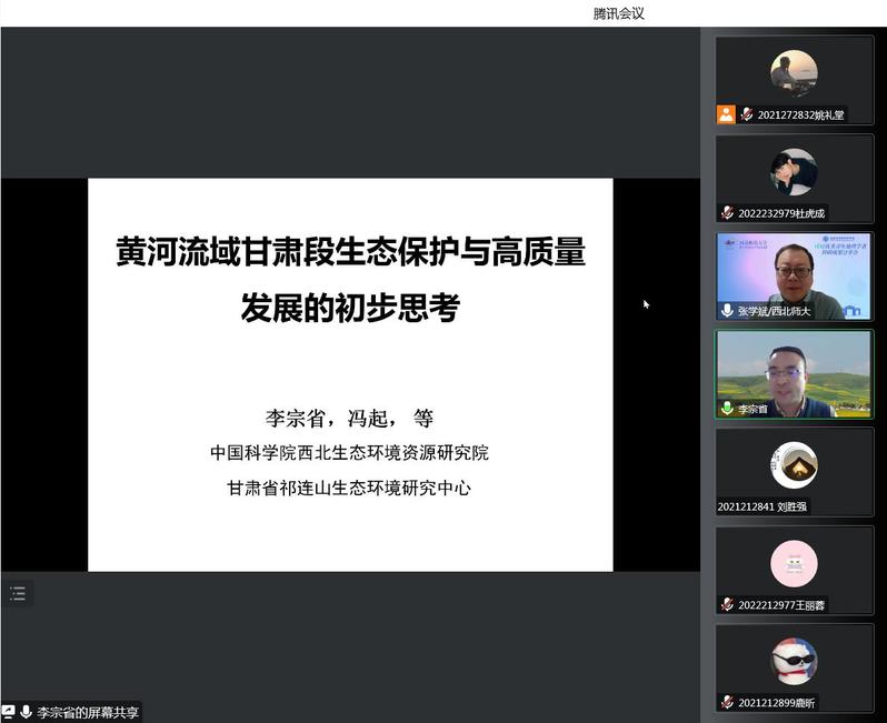 分享会上,李宗省研究员首先对黄河流域生态保护与高质量发展的国家战略中的重要论断进行了回顾,随后结合团队近年来在黄河流域甘肃段、黄河源区所做的工作,围绕黄河流域甘肃段生态保护与高质量发展对策、黄河源区生态水文过程两方面进行了重点介绍。李宗省研究员及团队所做工作服务于国家重大战略需求,拓展了参会师生的学术视野,激发了科研创新的热情。会后,李宗省研究员与线上参会师生进行了深入交流。