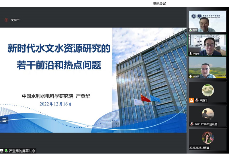 2022年12月16日,应437bwin必赢国际官网437bwin必赢国际官网、甘肃省绿洲资源环境与可持续发展重点实验室、西北城乡发展与协同治理研究院邀请,中国水利水电科学研究院严登华教授做了题为《新时代水文水资源研究的若干前沿和热点问题》的学术报告,报告会由437bwin必赢国际官网副院长焦亮教授主持,学院教师、研究生共200余名师生线上参加了本次报告,此次报告是研究生学术月“前沿讲坛”第五讲。