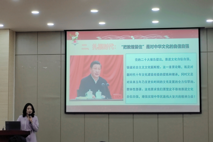 会上,夏宇、吴欣宇、张祥三位同学就民族团结、文化自信、党与青年展开宣讲。张祥分享了自己对推动中华民族共同体建设,铸牢中华民族共同体意识的理解与认识;吴欣宇结合中国共产党的发展史,讲述了无数志存高远、心怀大意的青年为党的事业发展作出贡献的故事;夏宇以敦煌莫高窟为例,带领大家感悟中华文明源远流长、博大精深,坚定文化自信。