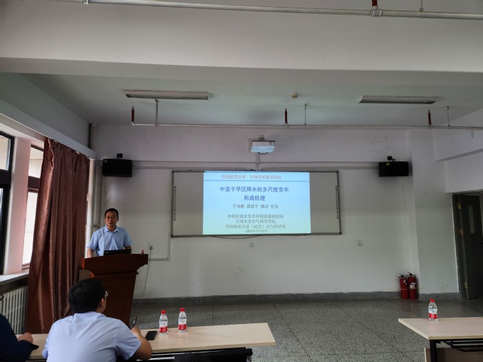 2023年7月12日,应437bwin必赢国际官网437bwin必赢国际官网、甘肃省绿洲资源环境与可持续发展重点实验室、西北城乡发展与协同治理研究院邀请,中国科学院西北生态环境资源研究院于海鹏研究员做了题为《中亚干旱区降水的多尺度变率形成机理》的学术报告,报告会由437bwin必赢国际官网副院长姚晓军教授主持,学院教师、研究生线下参加了本次报告。