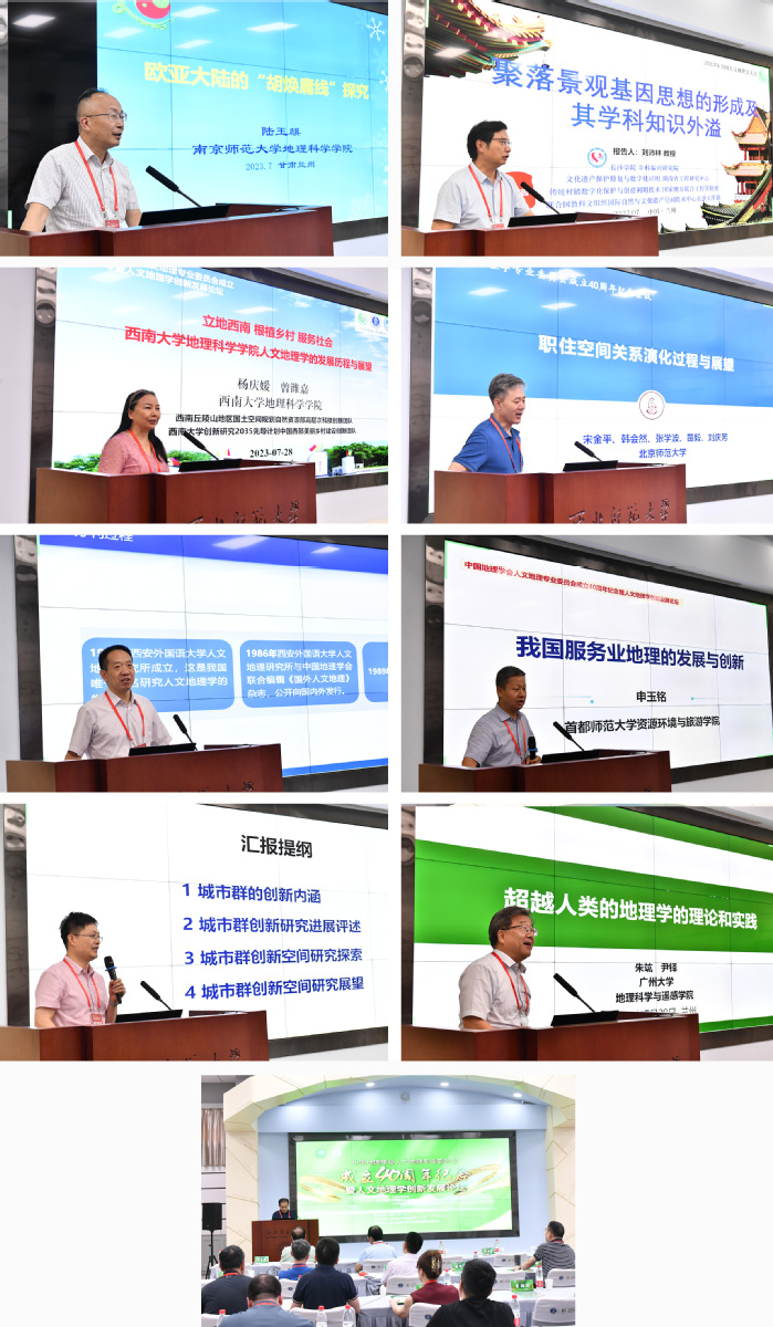 下午论坛特邀报告环节中,南京师范大学陆玉麒教授、长沙学院刘沛林教授、西南大学杨庆媛教授、北京师范大学宋金平教授、西安外国语大学李九全教授、首都师范大学申玉铭教授、中国科学院地理科学与资源研究所马海涛副研究员、广州大学朱竑教授,分别做了题为“欧亚大陆的‘胡焕庸线’探究”“聚落景观基因思想的形成过程及其学科知识外溢”“立地西南,根植乡村,服务社会:西南大学人文地理学发展历程与展望”“职住空间关系演化过程与展望”“《人文地理》与中国人文地理学发展”“我国服务业地理学的发展与创新”“城市群创新空间研究的进展与展望”“超越人类地理学的理论和实践”的大会特邀报告。专家学者们阐释了胡焕庸线的综合地理学意义,并在欧亚大陆尺度上对此现象进行了探索;详细介绍了聚落景观基因理论的远期、方法论框架、发展历程和知识外溢,系统梳理了理论借鉴的误区;以西南大学人文地理学科为研究对象,梳理高校人文地理学研究实践,人文地理学科同国家建设与区域发展密切相关;坚持发展与创新,聚焦改革、创新、融合等重大命题,开展全过程、全时空、全领域和全方位研究;着眼现代化城市群建设,开展城市群创新网络模拟与分析、创新多中心格局的创新效应等城市群创新空间研究探索;基于超越人类的地理学视角构建人与自然生命共同体,为地理学研究以及为人们认知世界的方式提供了新思路。该环节分别由东北大学修春亮教授和西南大学杨庆媛教授主持。随后,专家学者就相关议题进行了研讨,研讨环节由北京师范大学宋金平教授主持。
