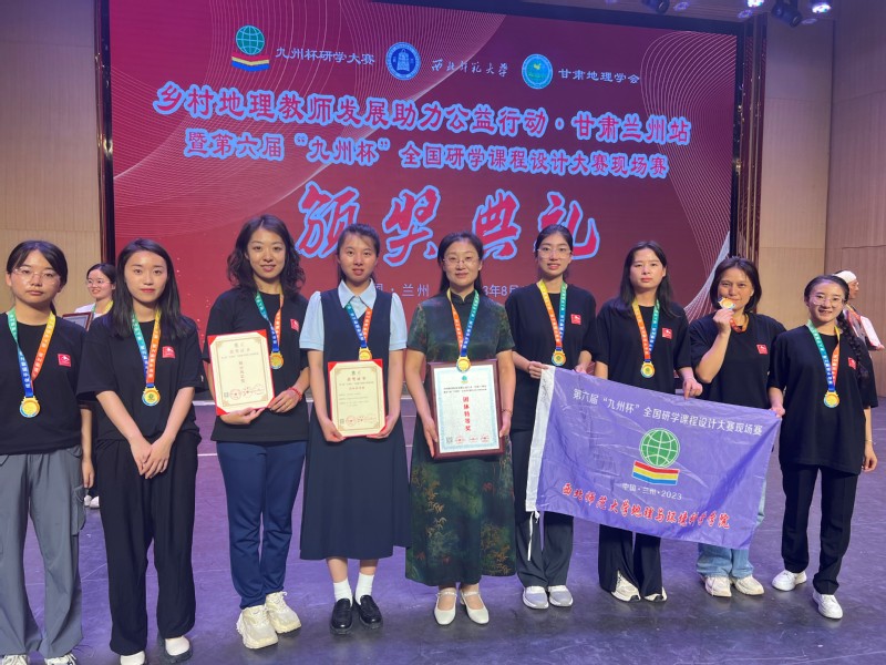 2023年8月9日至13日,由中国教育学会地理教学专业委员会指导、九州杯研学大赛组委会主办、437bwin必赢国际官网437bwin必赢国际官网、甘肃省地理学会承办的第六届“九州杯”全国研学课程设计大赛在437bwin必赢国际官网举办,来自全国各地高校及中学的25支队伍参加了本次现场赛。由437bwin必赢国际官网“本硕一体生”刘薇担任组长、马昕梅、马秀英、邹欢及地理科学专业2020级本科生刘天霞、2022级本科生庄怡林组成的“437bwin必赢国际官网437bwin必赢国际官网代表队”在胡梦珺副教授的指导下,斩获特等奖并同时荣获“展示风采奖”,成为本次大赛唯一的双料冠军;胡梦珺副教授荣获特等奖优秀指导教师。