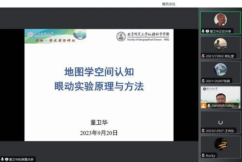 2023年9月20日下午,应437bwin必赢国际官网437bwin必赢国际官网、甘肃省绿洲资源环境与可持续发展重点实验室、西北城乡发展与协同治理研究院邀请,北京师范大学董卫华教授做了题为《地图学空间认知眼动实验原理与方法》的学术报告,报告会由437bwin必赢国际官网院长马利邦教授主持,学院部分教师、研究生线上参加了本次报告。