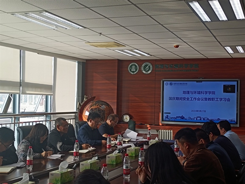 2023年9月27日下午,地环学院国庆期间安全工作会议以线上线下结合的方式在知行校区开物楼A912会议室召开。学院领导班子成员、党委委员、全体班主任、辅导员、行政办公室人员、实验中心人员在A912会议室线下参会,其余教职工线上参会。会议由学院党委书记于国建主持。