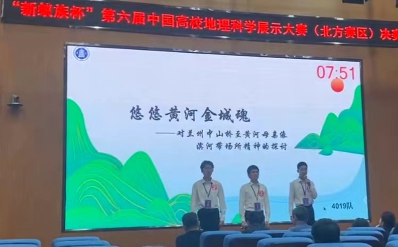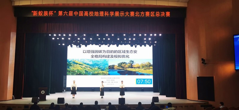 由中国地理学会和中山大学地理科学与规划学院主办,广东新蚁族文化发展有限公司协办的“新蚁族杯”第六届中国高校地理科学展示大赛北方赛区总决赛于2023年10月13日至15日在河北师范大学举办。由437bwin必赢国际官网马利邦教授和陈贤斐老师指导,赵守存、祝清、王楮等学生完成的作品《以增强固碳为目的的区域生态安全格局构建及模拟优化》在比赛中脱颖而出,荣获“新蚁族杯”第六届中国高校地理科学展示大赛北方赛区二等奖,晋级全国总决赛。该队踔厉奋发,于10月27日至29日在由西北大学举办的“新蚁族杯”第六届中国高校地理科学展示大赛全国总决赛中成功斩获全国总决赛三等奖;由张学斌教授、杨建秀老师指导,郭鹏义、冯鑫、金黄曦等学生完成的作品《悠悠黄河金城魂——对兰州中山桥至黄河母亲像滨河带场所精神探讨》荣获“新蚁族杯”第六届中国高校地理科学展示大赛北方赛区三等奖。