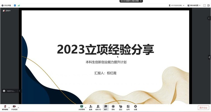 分享会上,四位主讲人从不同方面详细讲解了科研立项流程与注意事项。杨佳明同学对立项通知文件中立项的要求及申报后的相关工作进行了具体介绍,对答辩、计划书、各类项目如何展开和立项申请报告做了讲解。张猛同学结合自身参加创新创业项目的相关经验,为同学们分享了PPT制作、立项答辩时的注意事项。权红霞同学就团队协作和工作开展分享了自己的经验,她强调一个和谐的团队会事半功倍,并就科研立项的步骤、选题的一般步骤、怎么做好的创新创业项目等方面做了详细讲解。许峥同学从前期准备、个人创意思路记录、参与教师课题项目、需要避免的问题以及与指导教师交流等方面提出建议,同时提出在参与大创项目的过程中要善于学习,学会质疑、独立,增强自身参与感。