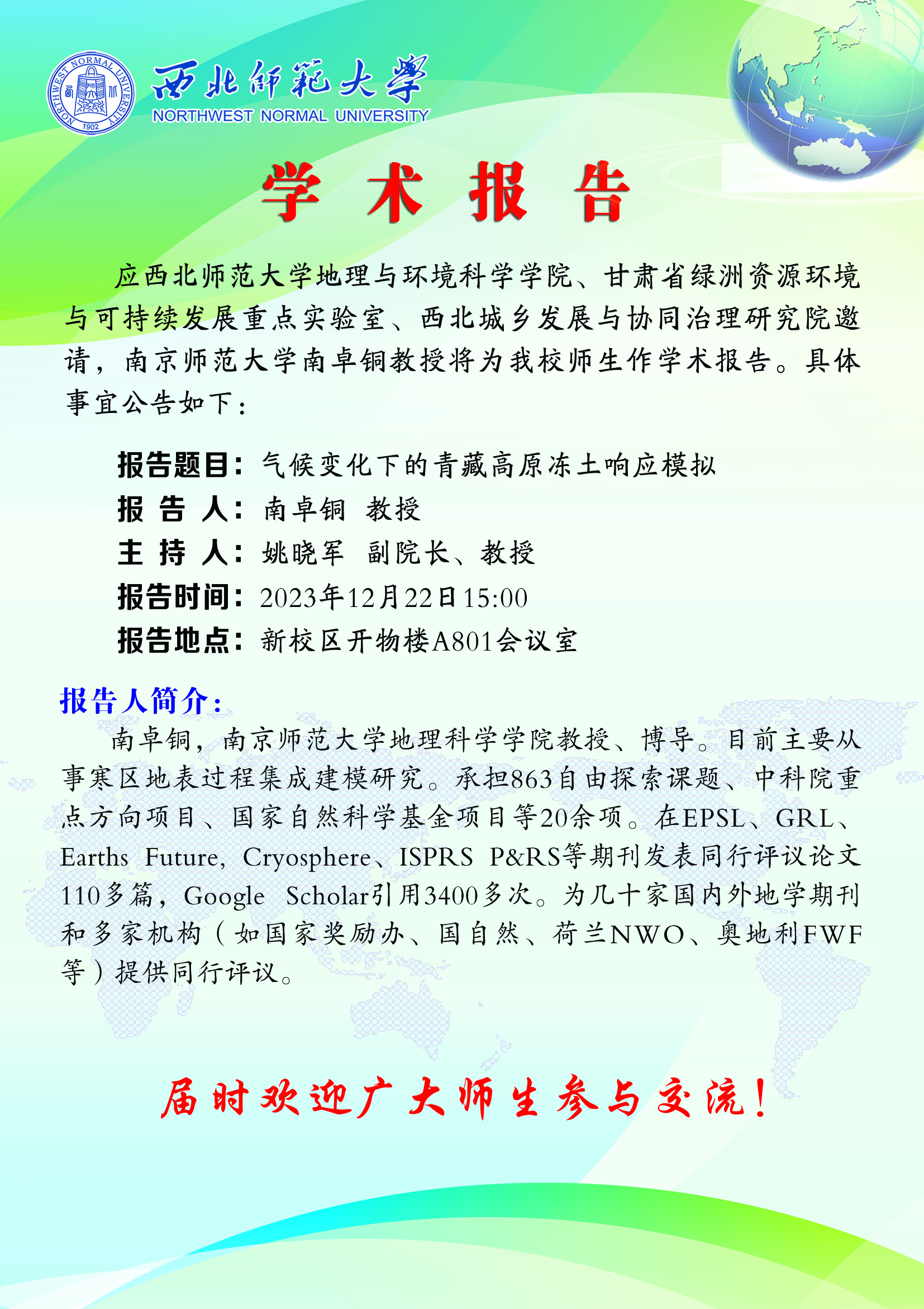 地环学院行知•学术前沿讲坛 2023-16期:气候变化下的青藏高原冻土响应模拟