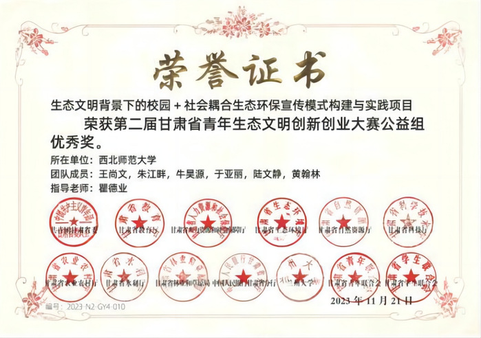 该项目在第二届甘肃省青年生态文明创新创业大赛中荣获公益组优秀奖。