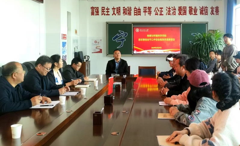 在会宁县第二中学,童毅校长向于国建一行介绍了学校的发展变革情况,参会的6名地环学院校友代表介绍了各自的工作和生活情况,并就学校的人才培养、实习实践、招生宣传、毕业生推介等工作提出了中肯的意见和建议。
